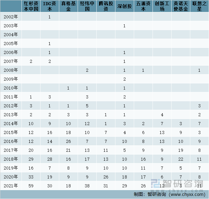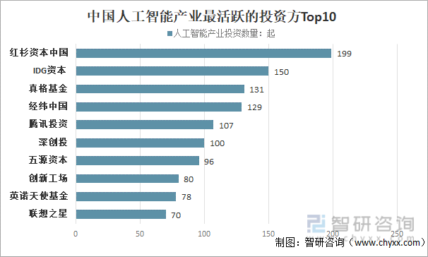 截止 2021 年,中国人工智能产业投资数量 Top10 投资方依次为红杉资本中国(199 起)、IDG 资本(150 起)、真格基金(131 起)、经纬中国(129 起)、腾讯投资(107 起)、深创投(100 起)、五源资本(96 起)、创新工场(80 起)、英诺天使基金(78 起)、联想之星(70 起)。