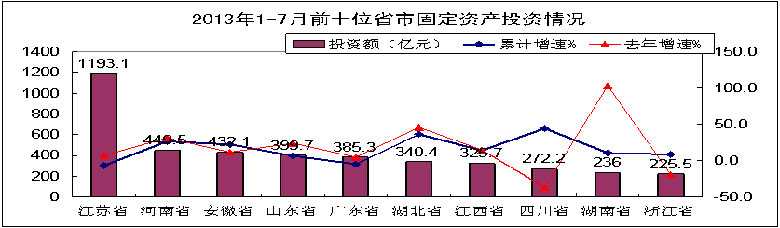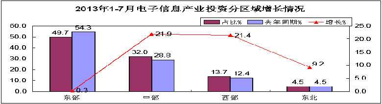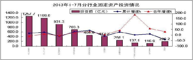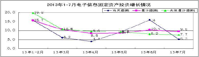 2013年前7个月,电子信息产业固定资产投资整体仍处于低增长区间,但5月以来波动回升趋势明显,集成电路、通信设备等部分行业增势突出,部分行业和地区降幅收窄。主要特点如下: