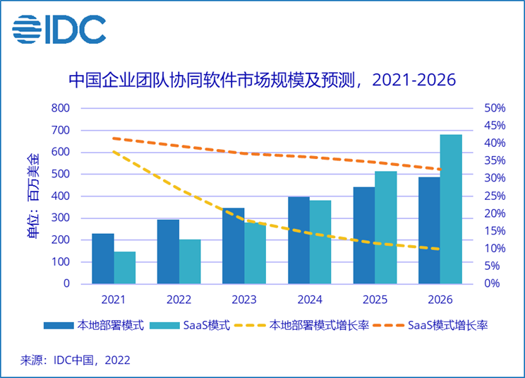 自新冠疫情爆发以来,企业团队协同软件在保障社会的工作、生产、教育和生活方面发挥了重要作用。SaaS 模式产品由于即开即用和较低的初期投入等优势,成为很多企业和组织在疫情时期的应急首选,使企业团队协同 SaaS 市场规模得到快速的增长。IDC 最新发布的《2021 年中国企业团队协同软件市场跟踪报告》显示,2021 年中国企业团队协同软件市场规模为 3.8 亿美元,同比增长 39.1%。其中,SaaS 模式的企业团队协同软件规模为 1.5 亿美元,同比增长 41.4%。IDC 预测,在未来五年,企业团队协同 SaaS 市场的增速要远高于本地部署模式,企业团队协同 SaaS 软件的未来 5 年复合增长率预计为 36.0%。预计在 2025 年,企业团队协同 SaaS 的市场份额将超过本地部署模式市场。