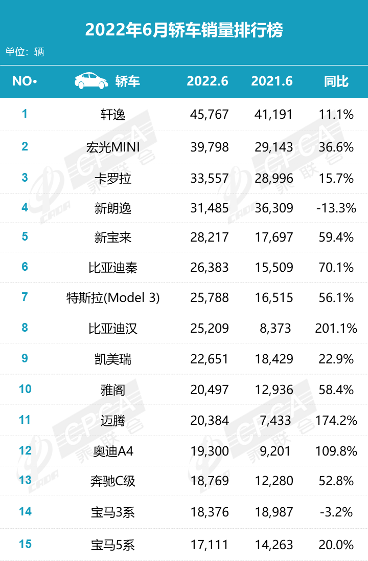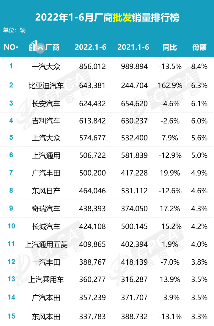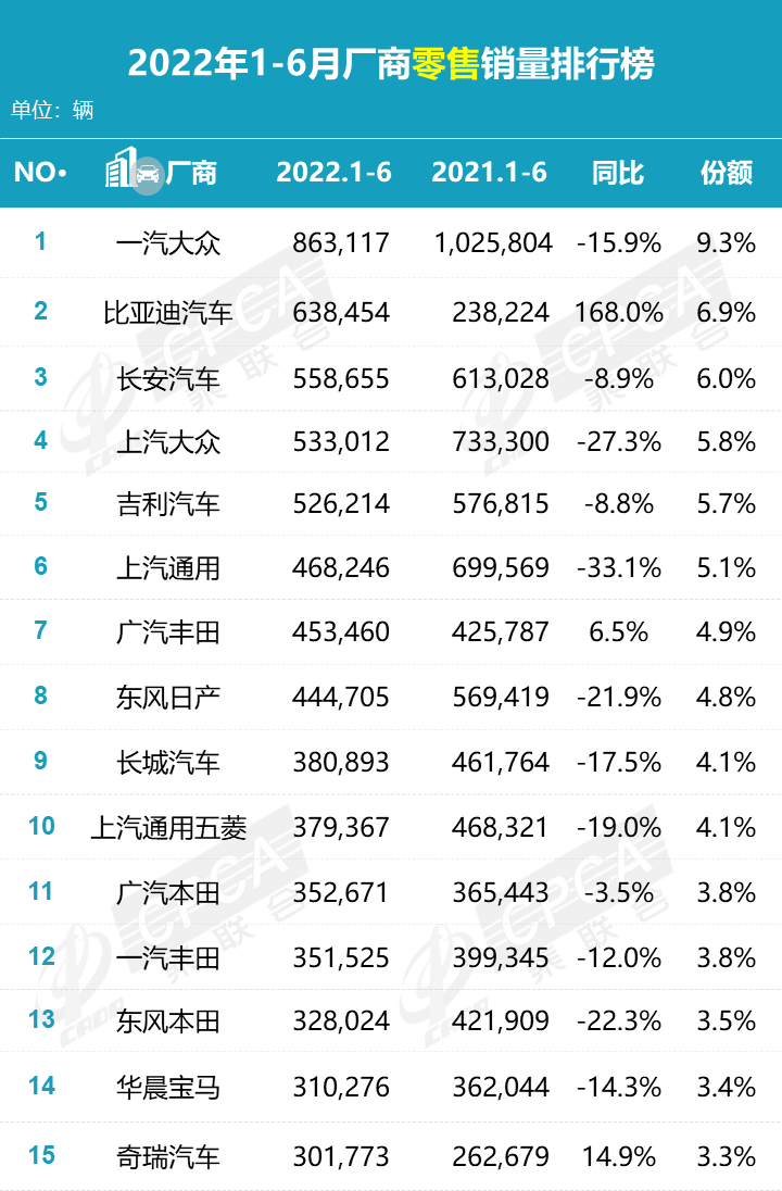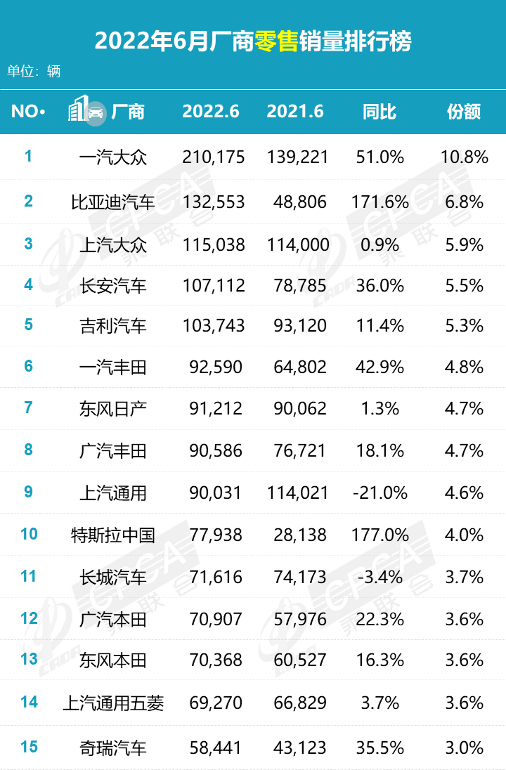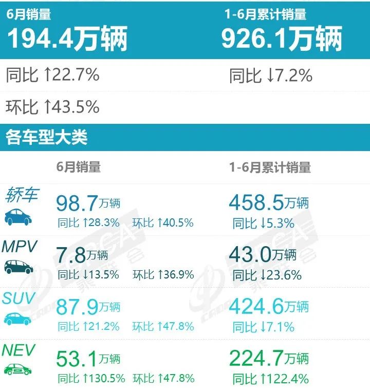 据中国汽车流通协会汽车市场研究分会(乘联会)最新零售销量数据统计,6 月份国内狭义乘用车市场销量达 194.4 万辆,同比增长 22.7%,环比增长 43.5%;1-6 月份累计销量 926.1 万辆,同比下降 7.2%。