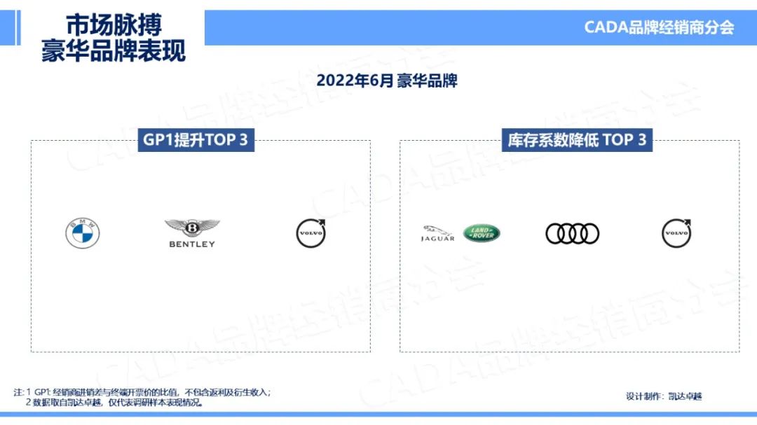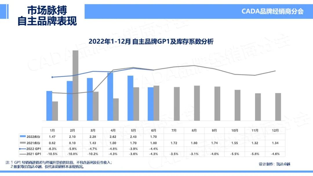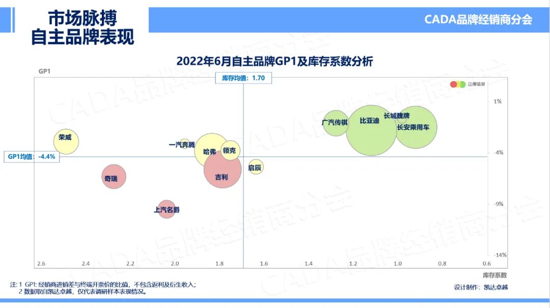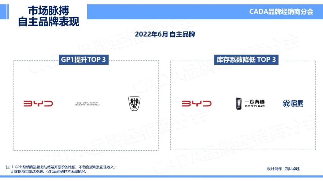 2022年6月,自主品牌中GP1提升最优的三个品牌为:比亚迪、哈弗、荣威;库存系数降低的三大品牌为:比亚迪、奔腾、启辰。