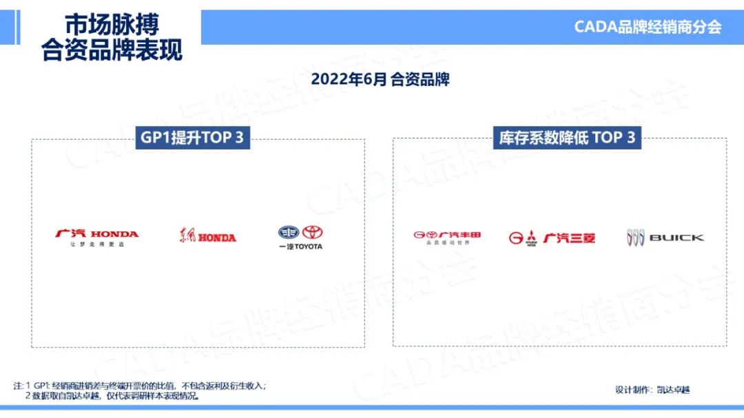 本月合资品牌表现中, GP1提升TOP3品牌分别为:广汽本田、东风本田、一汽丰田;库存系数降低TOP3的品牌分别为:广汽丰田、三菱、别克。