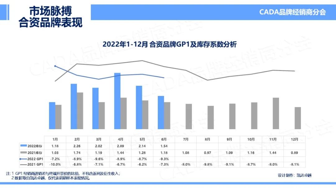 2022年6月,合资品牌库存系数降低至1.54,GP1降至-9.3%。随着《关于减征部分乘用车车辆购置税的公告》政策出台,主销产品售价在30万以下的合资品牌和自主品牌享受了较大政策红利,促进了合资品牌市场的发展。但合资品牌新能源产品力差,在自主新能源品牌加速抢占合资品牌市场份额的大背景下,合资品牌将持续面临严峻的生存压力。