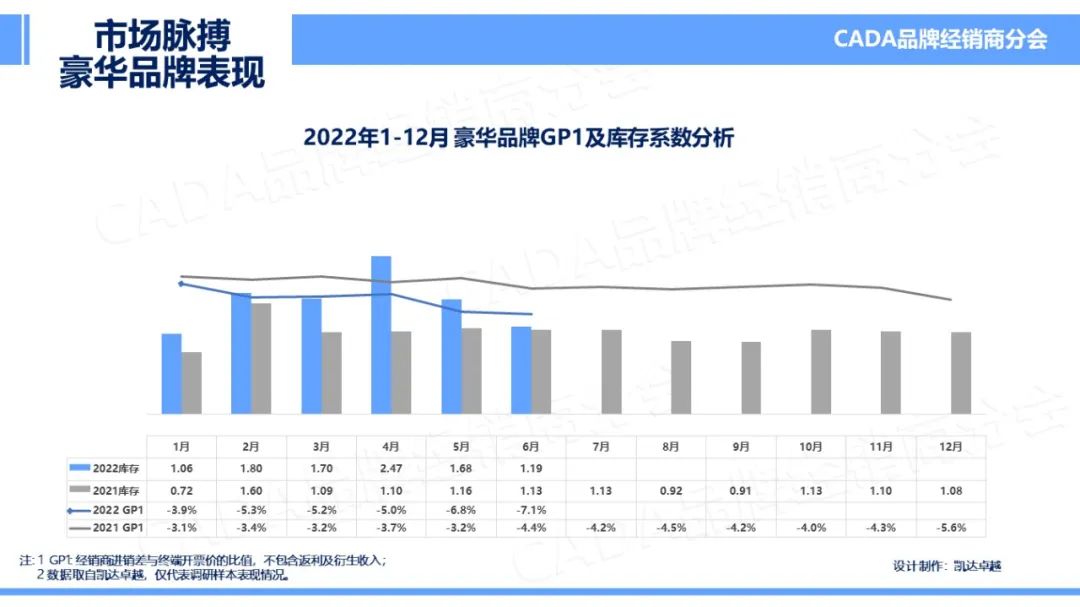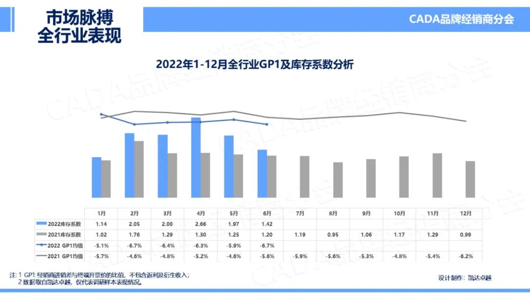 2022年6月,北京、上海两个超一线城市解禁,其他各地区汽车市场加速回暖,加之国家促消费政策频频出台,全国各省市也陆续出台车辆新购补贴、以旧换新和放宽限购等地方性激励政策,总体6月汽车流通市场出现销量大幅增长,全国库存系数均值降至1.42,销量增长但同时也带来了GP1的进一步降低。
