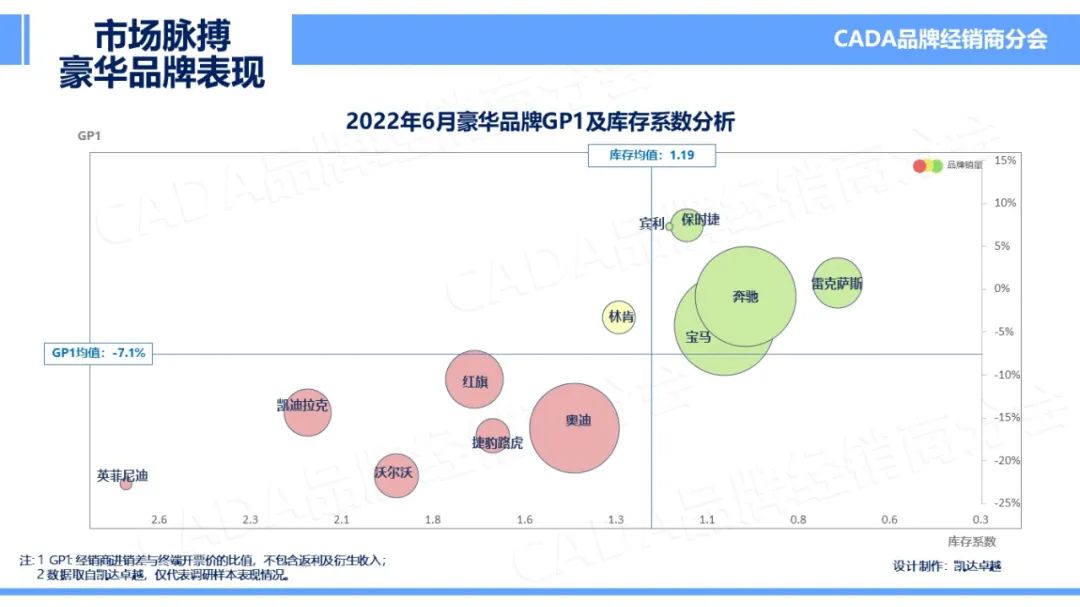 2022年6月,豪华品牌销量增长迅速、库存系数大幅下降。受疫情防控形势好转,加之不断释放鼓励消费的政策及消费补贴的促进作用,大大促进了消费信心,全国各城市消费力得以恢复,豪华品牌客户的购买力首先获得释放,库存系数下降至1.19,GP1微降至-7.1%。