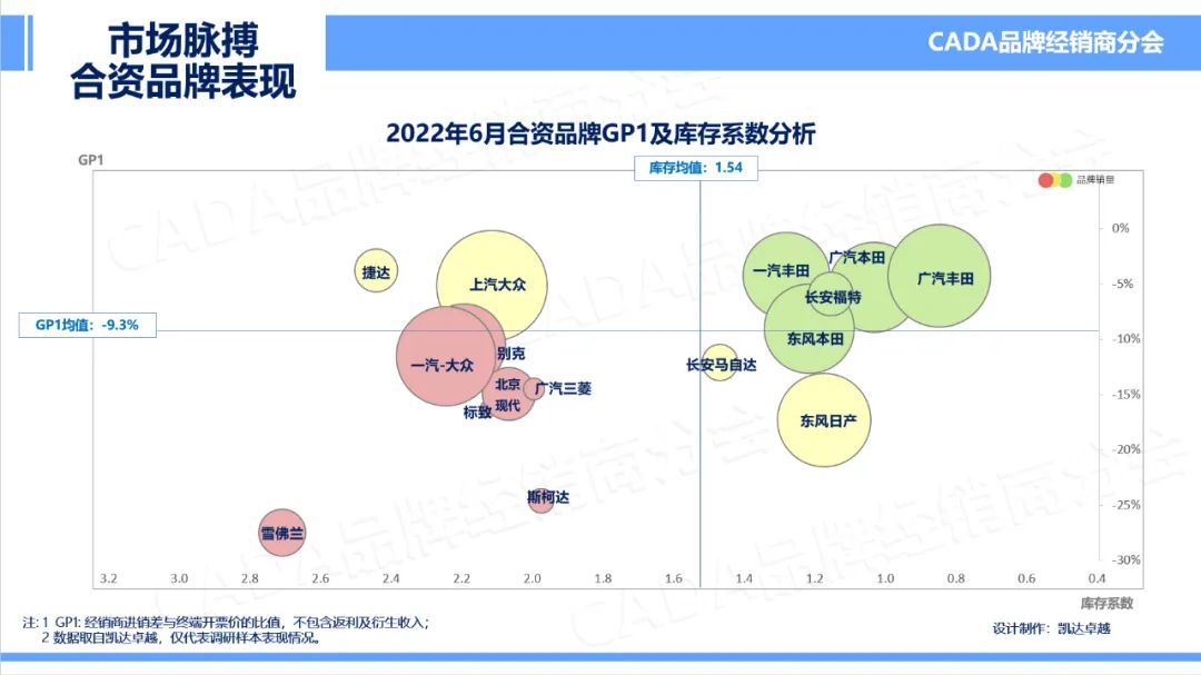 从具体品牌来看,库存、GP1双优的绿色区域品牌稳定,以日系品牌为主。上汽体系、一汽体系的几大品牌仍受疫情影响,生产力、供应链、销售力均面临很大挑战。6月经销商库存环比下降,但部分品牌仍处于较高位置。期待在7月相关政策逐步推进落实、人员进店提升后,相关品牌可以抓住机会,降低库存压力。