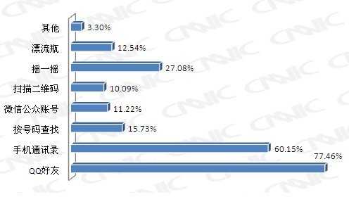 从微信用户主动添加好友的方式可以看出,微信是QQ在移动互联网上的一种延伸,77.46%的微信用户添加的好友是自己的QQ好友,QQ是微信背后的强大后备军。手机通讯录以60.15%的比例成为用户添加微信好友的第二大方式。当收到朋友通过验证请求时,61.77%的微信用户会通过熟人发来的验证请求,对于陌生人的请求基本采用直接删除、不添加的冷处理方式。相比较微博点对面的广播方式,基于手机通讯录、QQ好友等熟人关系圈子、进行点对点的精准沟通的微信,更着力于强关系链之间的信息分享。