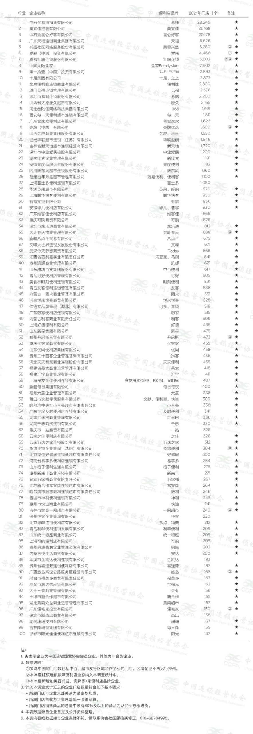 中国连锁经营协会根据“2021年便利店企业基本情况调查”结果,按照便利店企业截止2021年12月31日的门店总数量统计汇总,整理排列出了“2021年中国便利店TOP100”。