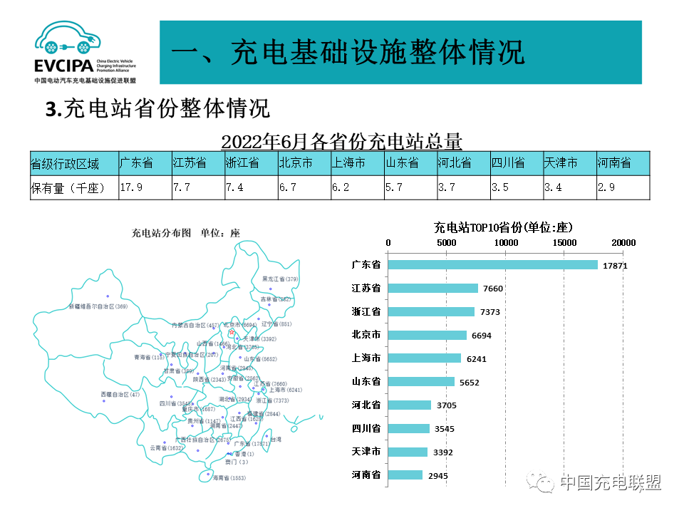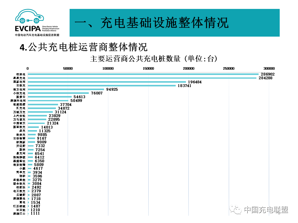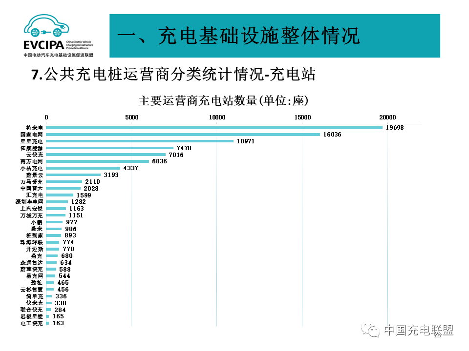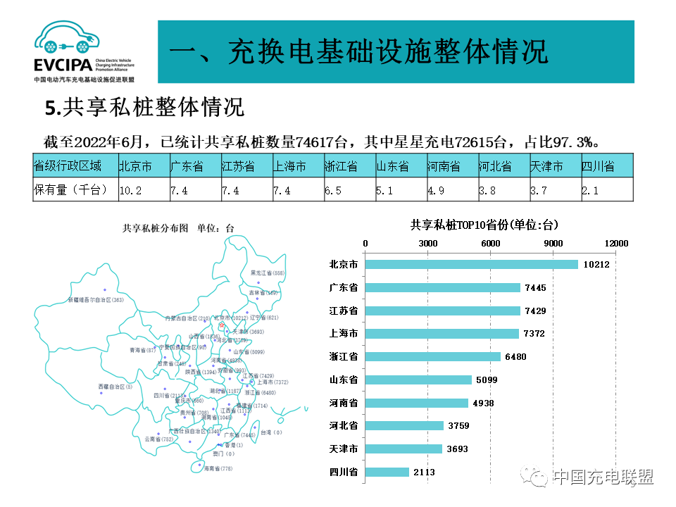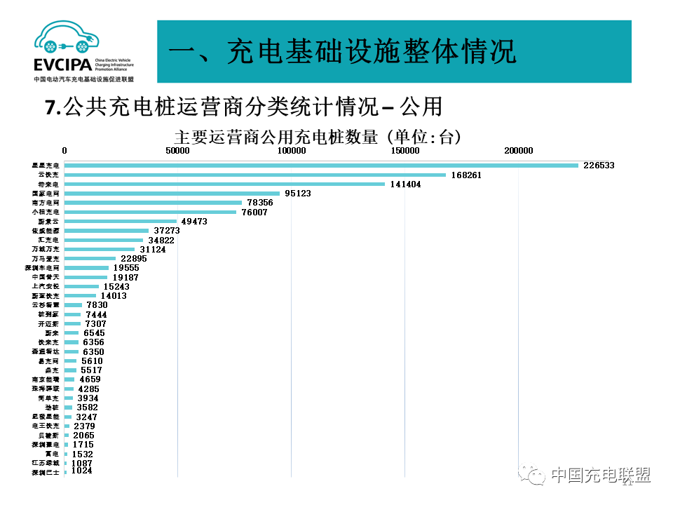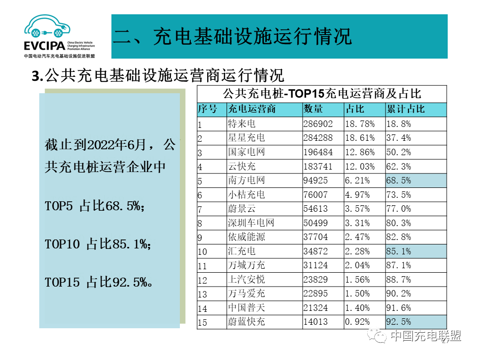 3、公共充电基础设施运营商运行情况,截止到2022年6月,全国充电运营企业所运营充电桩数量TOP15,分别为:特来电运营28.7 万台、星星充电运营28.4万台、国家电网运营19.6万台、云快充运营18.4 万台、南方电网运营9.5万台、小桔充电运营 7.6 万台、蔚景云运营5.5万台、深圳车电网运营5.0万台、依威能源运营3.8万台、汇充电运营3.5 万台、万城万充运营3.1万台、上汽安悦运营2.4万台、万马爱充运营2.3万台、中国普天运营2.1万台、蔚蓝快充运营1.4万台。这15家运营商占总量的92.5%,其余的运营商占总量的7.5%。