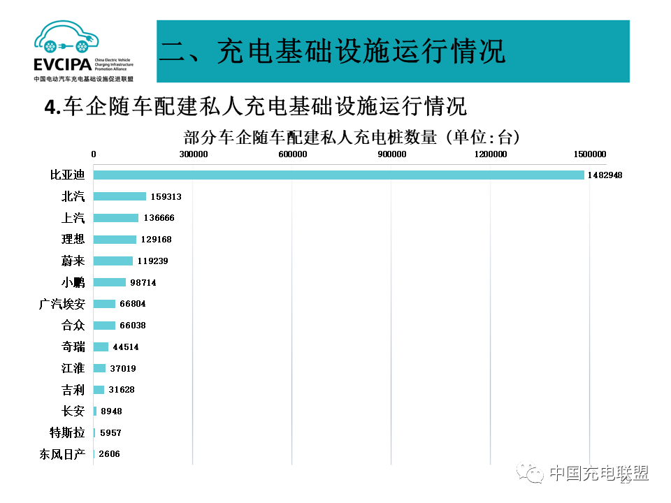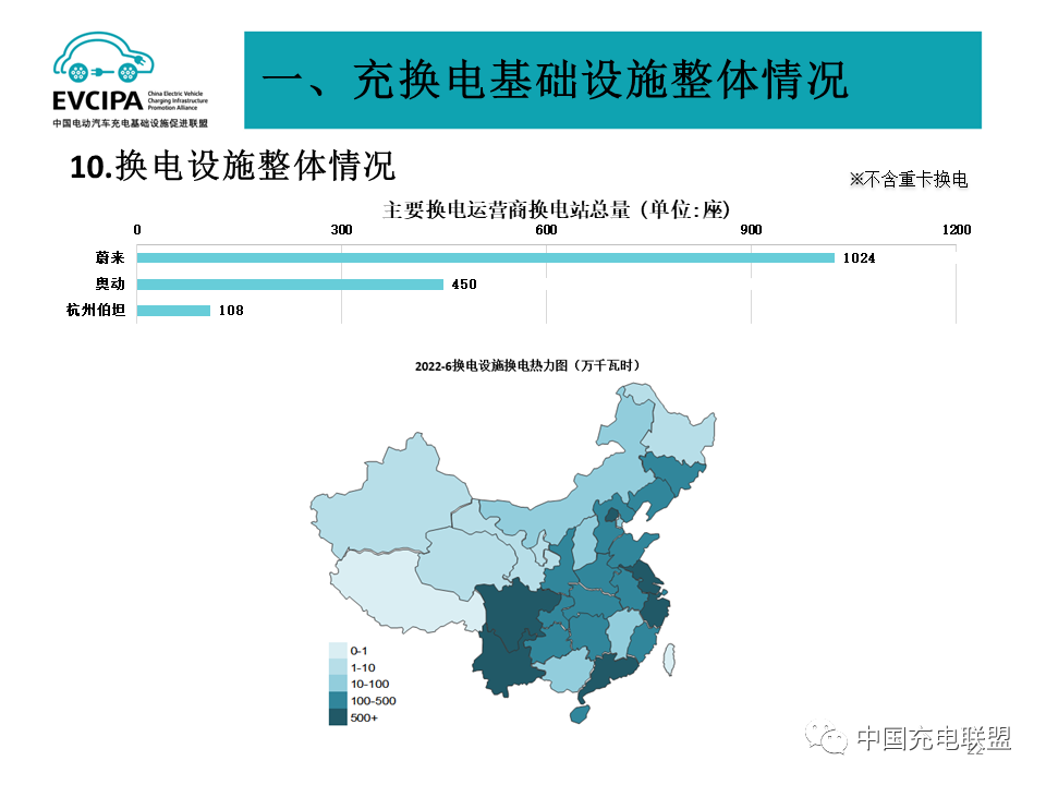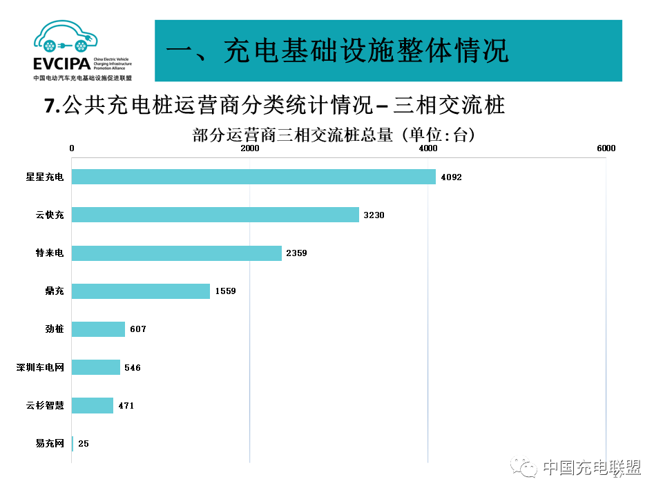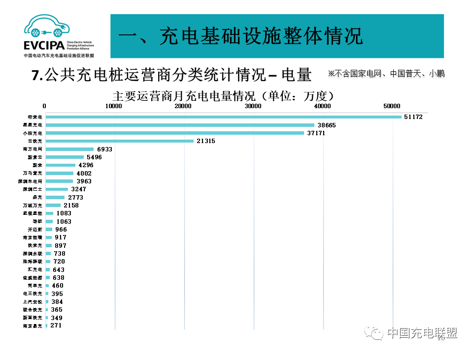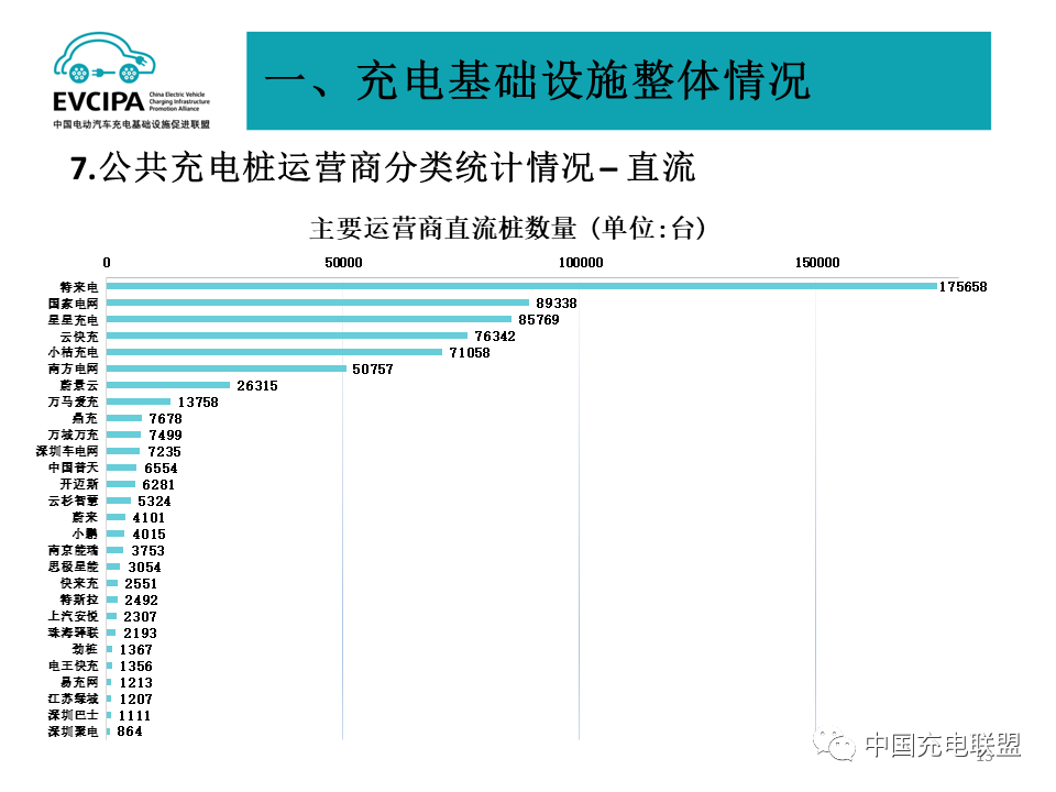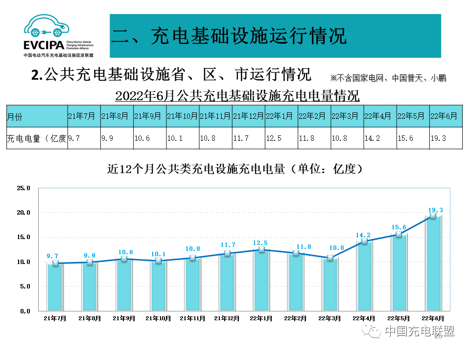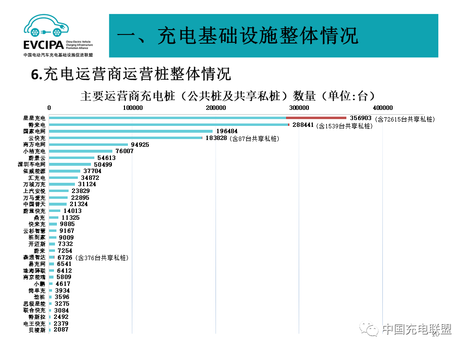 3、公共充电基础设施运营商运行情况,截止到2022年6月,全国充电运营企业所运营充电桩数量TOP15,分别为:特来电运营28.7 万台、星星充电运营28.4万台、国家电网运营19.6万台、云快充运营18.4 万台、南方电网运营9.5万台、小桔充电运营 7.6 万台、蔚景云运营5.5万台、深圳车电网运营5.0万台、依威能源运营3.8万台、汇充电运营3.5 万台、万城万充运营3.1万台、上汽安悦运营2.4万台、万马爱充运营2.3万台、中国普天运营2.1万台、蔚蓝快充运营1.4万台。这15家运营商占总量的92.5%,其余的运营商占总量的7.5%。