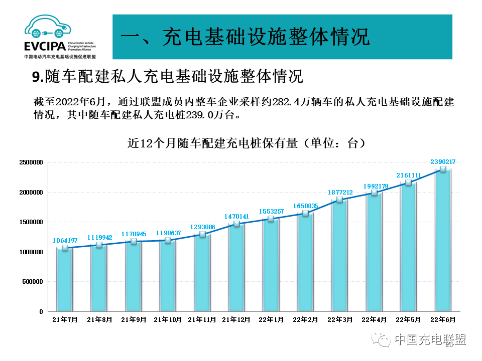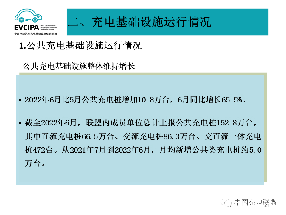 1、公共充电基础设施运行情况,2022 年 6 月比5 月公共充电桩增加10.8万台,6 月同比增长65.5%。截至2022 年 6 月,联盟内成员单位总计上报公共充电桩152.8万台,其中直流充电桩66.5万台、交流充电桩86.3万台、交直流一体充电桩472台。从2021年7 月到2022 年 6 月,月均新增公共类充电桩约5.0万台。