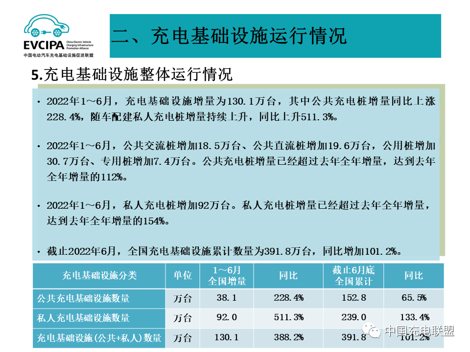 4、充电基础设施整体运行情况,2022年1~6月,充电基础设施增量为130.1万台,其中公共充电桩增量同比上涨228.4%,随车配建私人充电桩增量持续上升,同比上升511.3%。2022年1~6月,公共交流桩增加 18.5 万台、公共直流桩增加19.6万台,公用桩增加30.7 万台、专用桩增加7.4万台。公共充电桩增量已经超过去年全年增量,达到去年全年增量的112%。2022年1~6月,私人充电桩增加92万台。私人充电桩增量已经超过去年全年增量,达到去年全年增量的154%。截止2022 年 6 月,全国充电基础设施累计数量为391.8万台,同比增加101.2%。