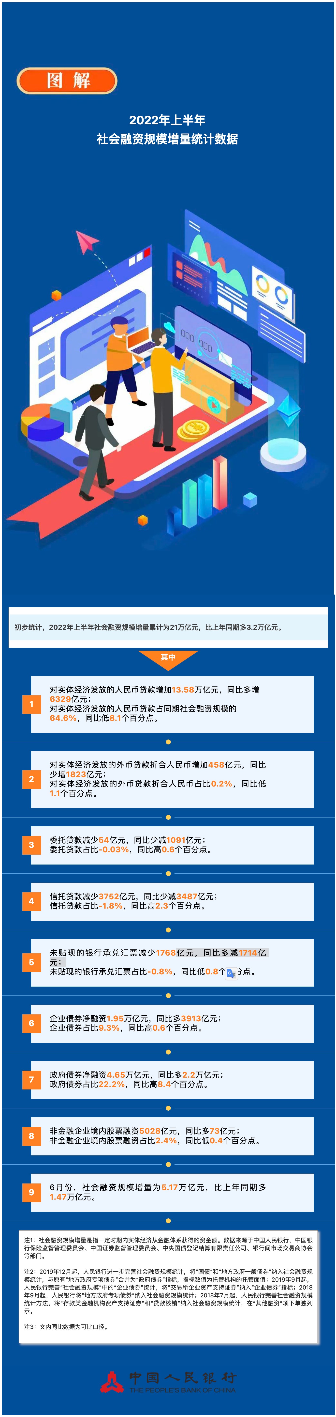 初步统计,2022年上半年社会融资规模增量累计为21万亿元,比上年同期多3.2万亿元。其中,对实体经济发放的人民币贷款增加13.58万亿元,同比多增6329亿元;对实体经济发放的外币贷款折合人民币增加458亿元,同比少增1823亿元;委托贷款减少54亿元,同比少减1091亿元;信托贷款减少3752亿元,同比少减3487亿元;未贴现的银行承兑汇票减少1768亿元,同比多减1714亿元;企业债券净融资1.95万亿元,同比多3913亿元;政府债券净融资4.65万亿元,同比多2.2万亿元;非金融企业境内股票融资5028亿元,同比多73亿元。6月份,社会融资规模增量为5.17万亿元,比上年同期多1.47万亿元。