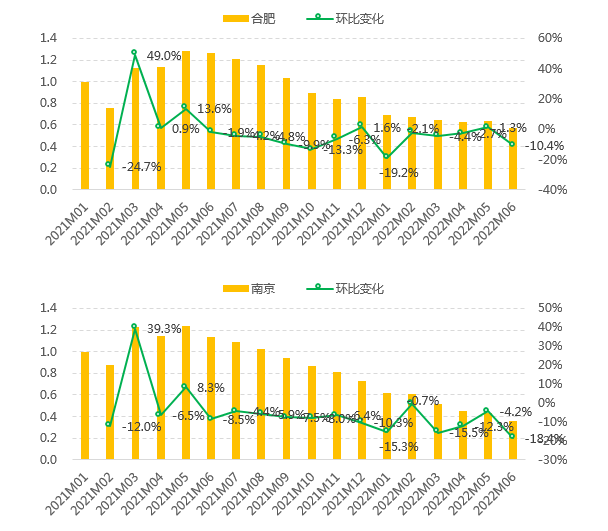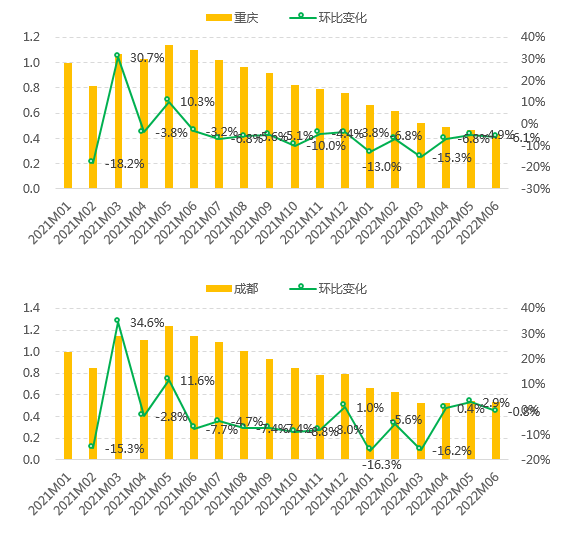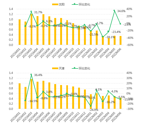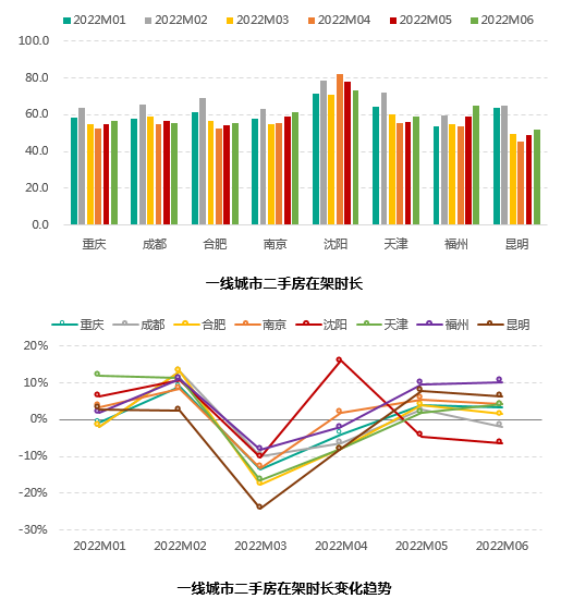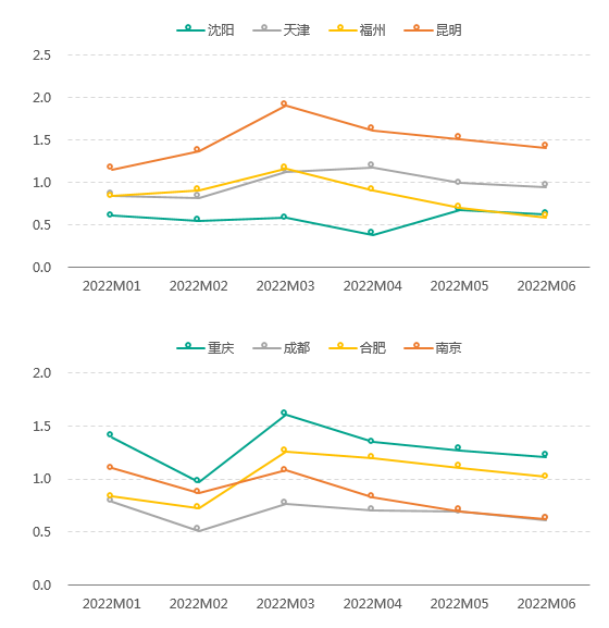 2022年6月,从热点城市二手房在架时长来看,沈阳和成都的在架时长出现了一定的回落,其他城市都出现了不同幅度的增长,从长远趋势来看,目前多数城市的二手房在架时长都在出现小幅增长的态势。