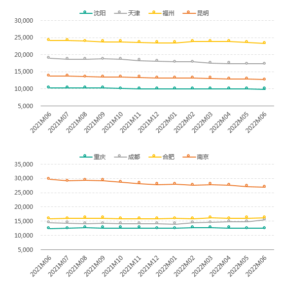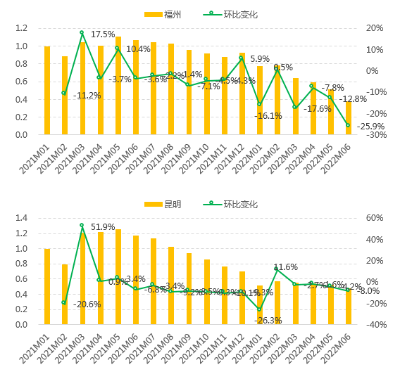 2022年6月,从热点城市二手房挂牌均价来看,成都、合肥出现了一定的上涨,其中成都的二手房挂牌均价出现了4.3%的上涨,其均价已达到历史的相对高点。而昆明的二手房挂牌均价也出现了连续5个月的下跌。