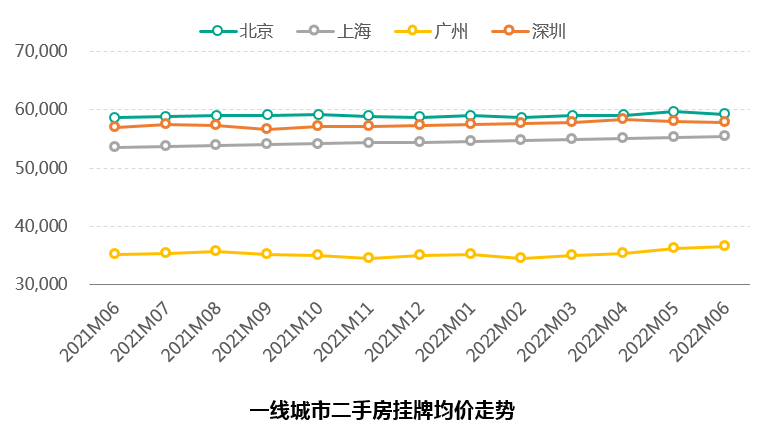 据58安居客房产研究院统计数据显示:2022年6月,一线城市中上海的二手房在架房源量出现了45%的增加,主要受到疫情恢复,城市基本复工复产而带来的挂牌量的增长。其他城市环比5月依旧处于回落状态,可见房地产经纪公司信心还是比较低迷。