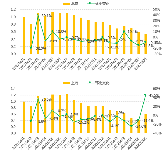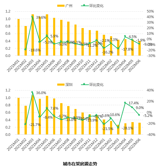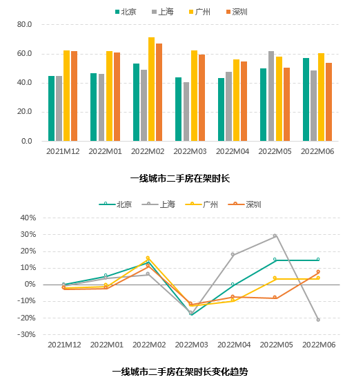 2022年6月,上海的二手房在架时长出现21.4%的大幅回落,在连续上涨两个月之后首次出现明显回落,表明二手房经纪业务也在逐步得到恢复。不过从北京的二手房在架时长来看,已连续两个月出现了14%的增长,表明疫情对北京的二手房时长影响还是比较明显的。深圳和广州的二手房在架时长也出现了小幅增长。