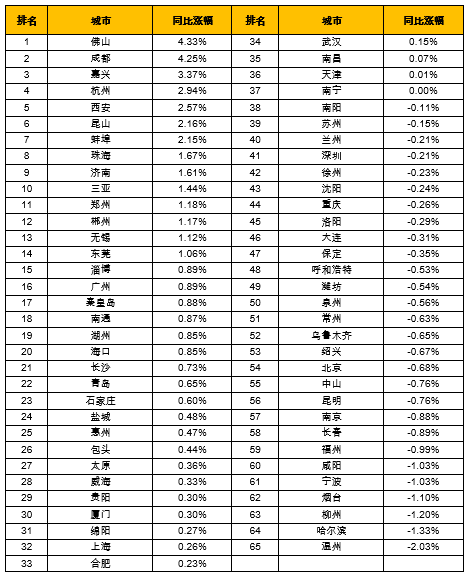 四、全国65城二手房挂牌价同比涨幅城市排行榜