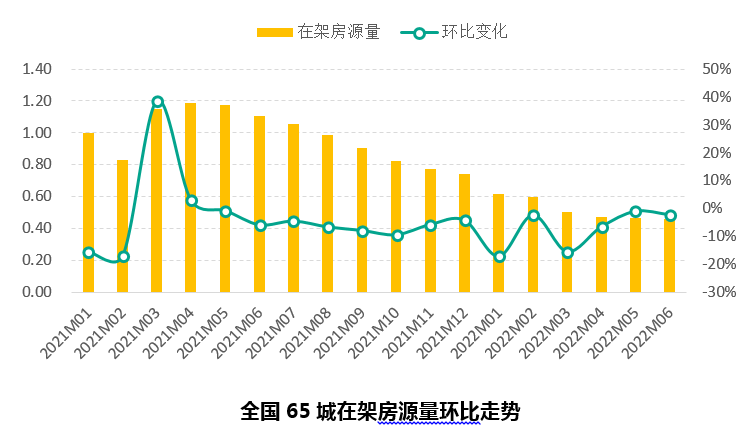 据58安居客房产研究院统计数据显示:2022年6月,全国65城二手房在架房源量环比下跌2.3%,二手房挂牌量连续出现回落。本月全国二手房在架量虽然依旧处于小幅回落态势,不过多数城市新房市场已经企稳回暖,预计二手房市场也会逐步回暖。