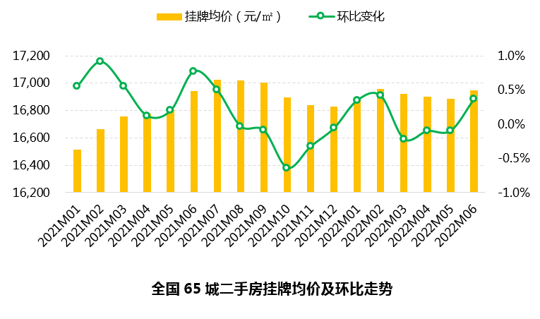 2022年6月,全国65城二手房挂牌均价为16948元/平方米,环比下跌0.36%,二手房挂牌均价出现一定上涨。挂牌价格的上涨首先是体现了房东对未来房价的预期出现了一定的提升,其次,市场逐步回暖也提升对未来的预期。