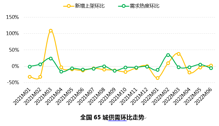 2022年6月,全国65城二手房新增上架房源环比增加3.4%,城市二手房购房需求热度环比下降5.1%。其中二手房挂牌房源量出现明显增加,表明了房东收到市场逐步企稳回暖对未来信心逐步回升,加大其挂牌意愿。
