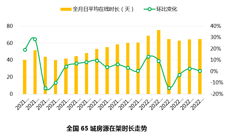 2022年6月,全国65城二手房在架时长为64.76天,与上月相当。本月,二手房在架时长虽然并未出现明显起伏,但是从部分城市来看变化还是较大的,尤其是疫情逐步恢复的上海和长春两城都出现了20%以上的缩短。