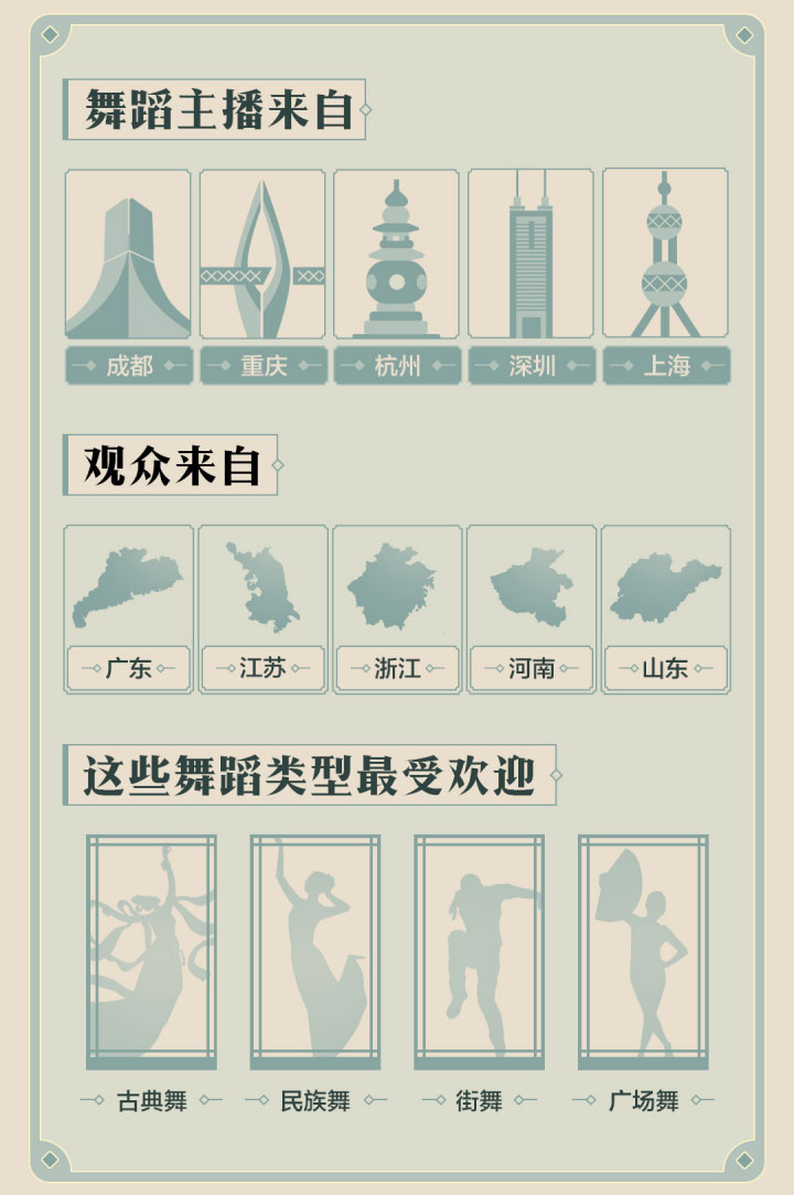 《报告》统计,平均每场舞蹈直播吸引4889人次观看,广东、江苏、浙江、河南、山东等地的观众居多。近年来,线下演出受阻,舞团、舞者纷纷走进直播间起舞。如今,不用走进剧院,观众通过抖音平台,不仅能看到古典舞、芭蕾舞的气韵形神,还能感受拉丁舞、国标舞的热情洋溢,更能跟随街舞主播学习流行舞步。中央芭蕾舞团、中央民族大学舞蹈学院、东方歌舞团、北京现代舞团、孔雀当代舞团等机构,都是观众喜爱的舞蹈“主播”。