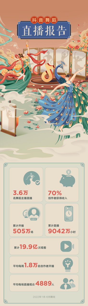 《报告》显示,2022年1月至6月,抖音平台3.6万名舞蹈主播累计直播9042万小时,带来505万场线上舞蹈演出,吸引19.9亿人次用户观看,其中70%主播获得收入。