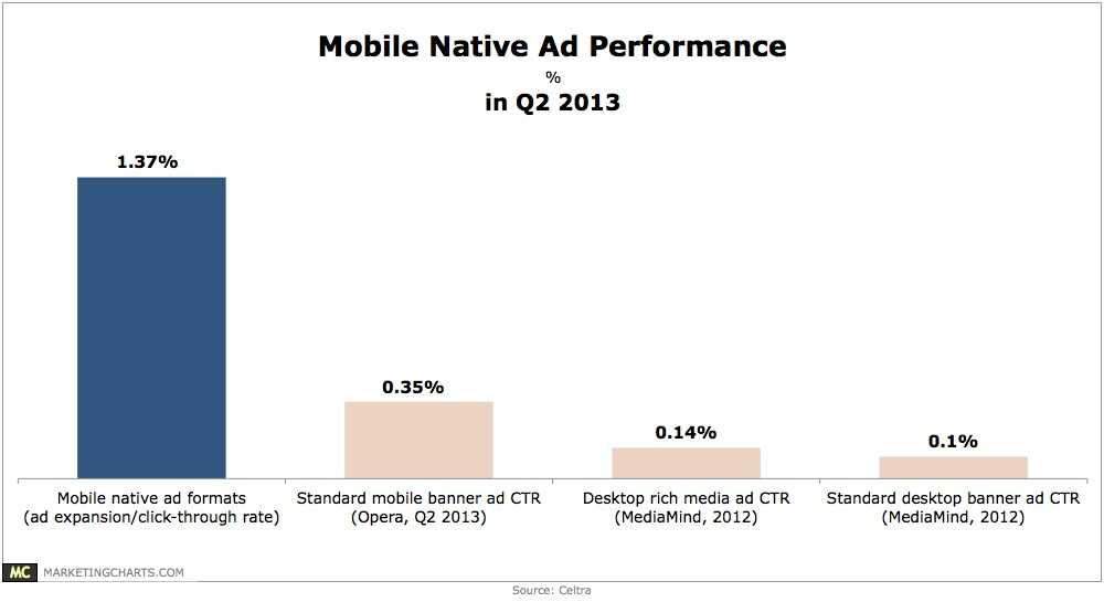 根据Celtra的最新数据,2013年Q2移动原生广告的扩展/点击率为1.37%,相较来自其他机构的其他类型的广告表现要更好。标准移动banner广告为0.35%(Opera),桌面富媒体广告为0.14%,标准桌面banner广告为0.1%(Mediamind)。