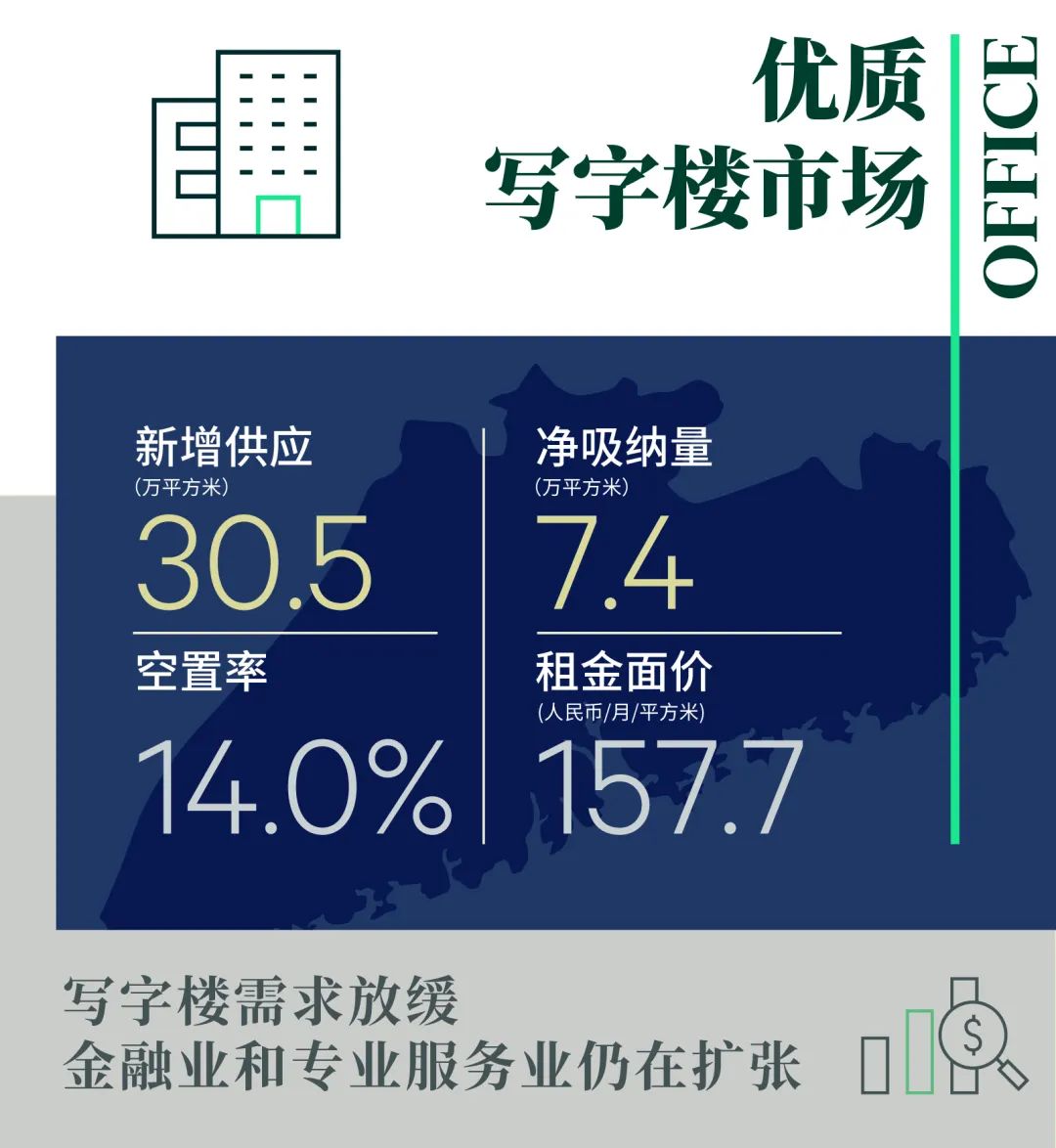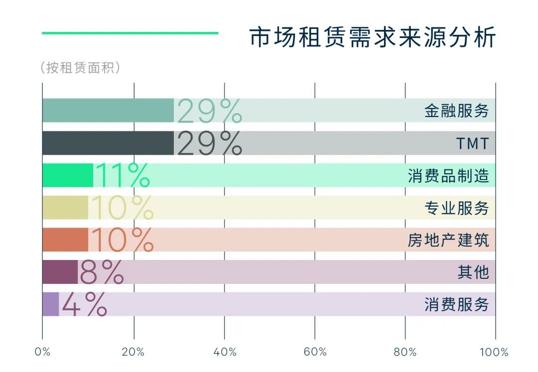 行业表现方面,金融业、TMT、消费品制造业和专业服务业需求最为活跃。受期货交易所带动,金融业中的非银金融——如基金及证券类均积极布局广州;专业服务业中的律师事务所表现也较为突出。分区域来看,珠江新城迎来多个承租能力较好的金融和专业服务业租户;琶洲则因可租面积充裕及价格有竞争力而录得多宗大面积租赁成交,租户行业囊括金融、TMT和消费品制造业等需求主力。