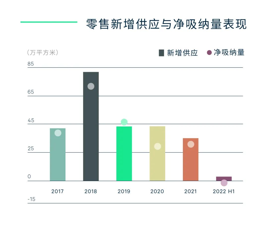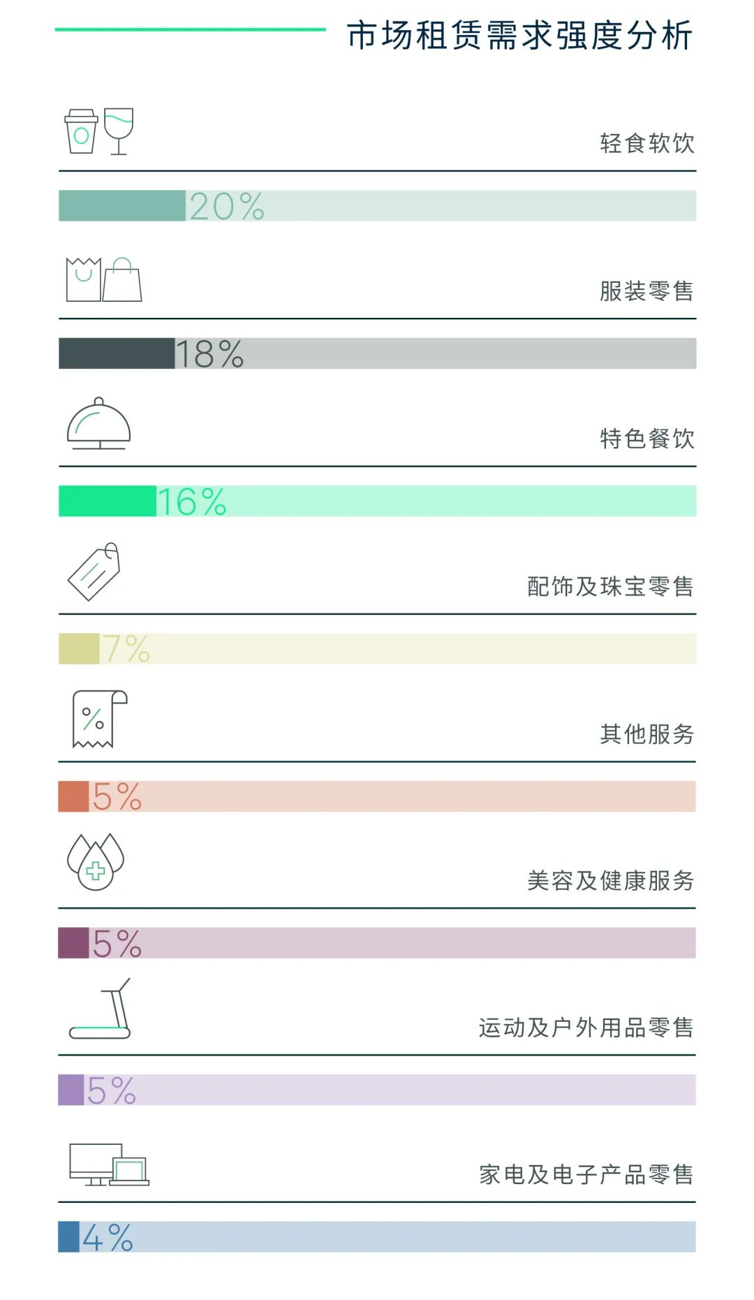 从成交来看,2022年上半年的餐饮新租表现突出,占全部新租赁成交的42.2%,几乎能与零售业态(42.9%)分庭抗礼。此现象主要归因于部分业主把大餐饮店铺改为多家小餐饮店铺的租户调整策略,导致新租餐饮店铺的数量得以增加。另外,轻食软饮(占比19.6%)凭借相对较强的承租力及迎合年轻消费者的装修风格,也受到部分业主的青睐。其中,咖啡茶饮品牌M Stand和.jpg较为活跃,九毛九孵化的怂火锅,也开始走出天河区,扩张至其他商圈。零售业态方面,首进广州的国内外品牌仍然青睐天河路,包括巴黎世家、Thom Browne、Breitling和Harmay话梅等。珠江新城则迎来国际化妆品牌在天河路以外的落址。最后,在体验类业态方面,学科类教育业态出现收缩,而新能源汽车的展厅则持续快速扩张,包括恒驰和沙龙汽车首店开张,以及沃尔沃、凯迪拉克和Smart开出新店或围板。