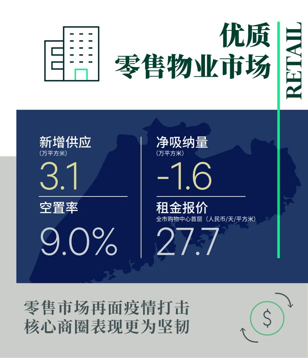 上半年广州录得一个购物中心开业。该商场位于黄埔区,商业面积超过3万平方米。尽管上半年广州供应量较少,且新商场开业率理想,但空置率仍然比2021年末上升0.5个百分点,至第二季度末的9.0%。空置率走高的原因一部分来自疫情波动,另一方面,商场在调改过程中,对主力租户的调整也是造成空置面积在短时间内增加的因素。随着空置压力上升,全市首层租金较去年末下降0.5%至二季度末的每天每平方米27.7元。