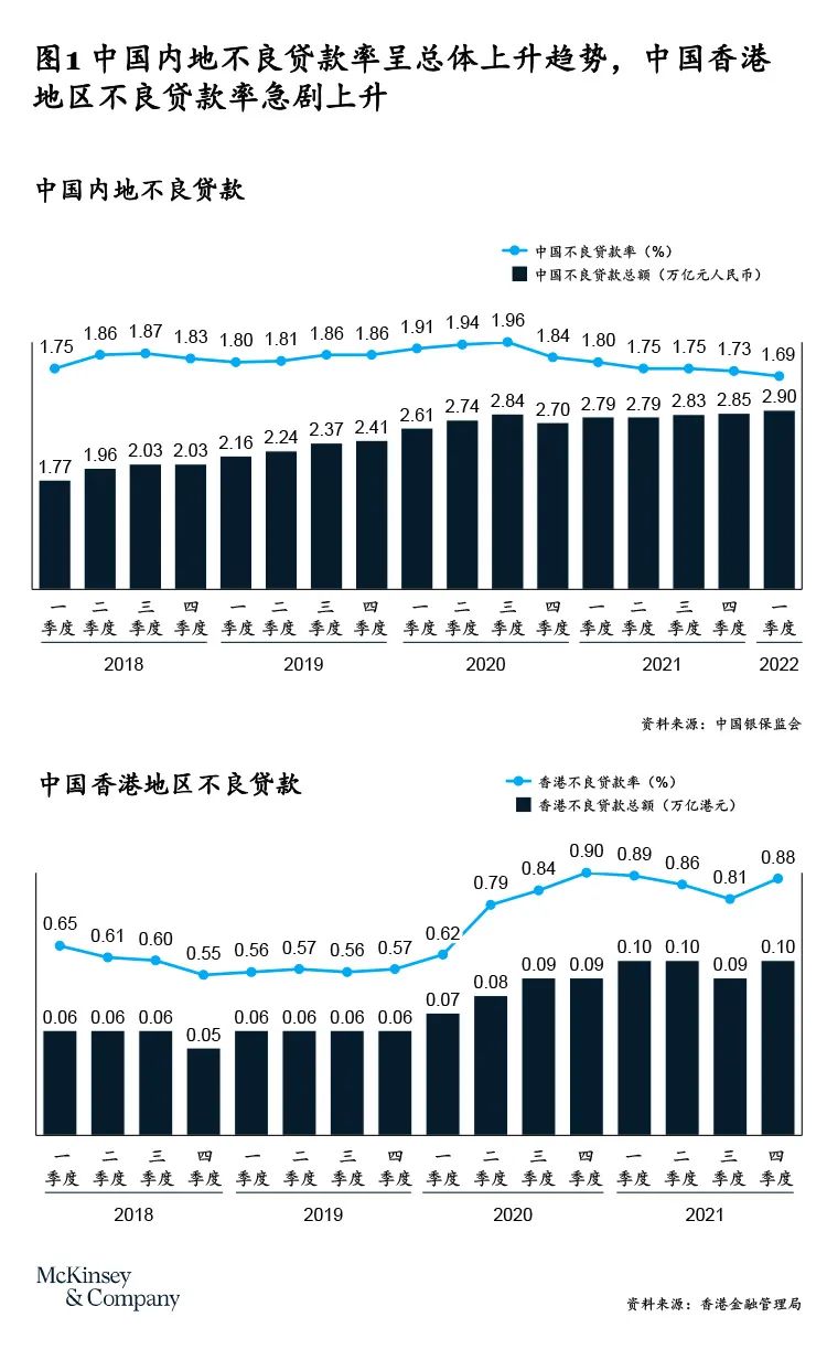 图 1 显示,疫情期间中国内地和香港地区的不良贷款迅速攀升。尽管 2021 年中国内地不良贷款率有所好转,但总额仍然很高。原因之一可能是贷款利率较低,导致贷款总额增加。香港地区的情况更严峻,长期受益于中国内地资金、旅游及奢侈品零售的行业始终未能复苏,原因是跨境旅行限制未能放松,以及香港对内地游客的吸引力下滑。