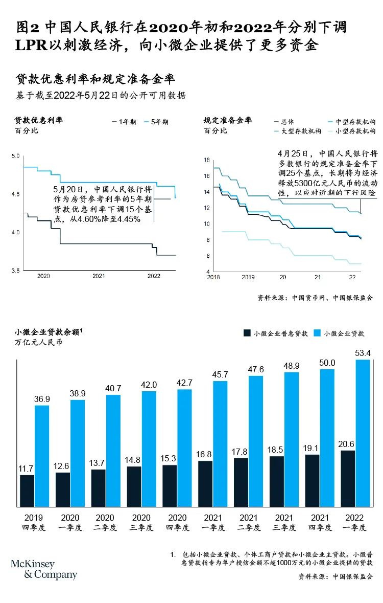 为维持复苏和发展态势,中国以稳字当头,实施了灵活和有针对性的货币政策。图 2 显示,中国人民银行在 2020 年初和 2022 年下调了 LPR,以刺激经济。除下调贷款利率外,还为小微企业提供了专项信贷支持。2020 年 6 月至 2021 年底,央行推出了两项直接支持实体经济的货币政策工具:普惠小微企业贷款延期支持工具和普惠小微企业信用贷款支持计划。自 2022 年 1 月起,上述两项货币政策工具在进行调整后继续实施。此外,2021 年 9 月,中国人民银行新增小微企业贷款 3000 亿元,鼓励本地商业银行增加对小微企业和个体工商户的贷款。