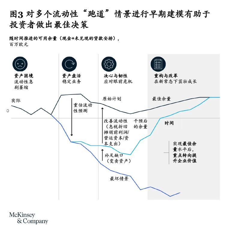 发生流动性危机时,时间远比利润宝贵。若无时间,企业就无法喘息,也没法根据业务环境的变化来调整自身状况。不幸的是,时间是奢侈品。债权人陆续给出最终还款期限,使得企业对营运资金的需求可能成倍增加。图 3 的结论表明,通过对多个流动性 “跑道” 情景进行早期建模,可帮助投资者做出最佳决策,节约世上最宝贵的资源——时间。