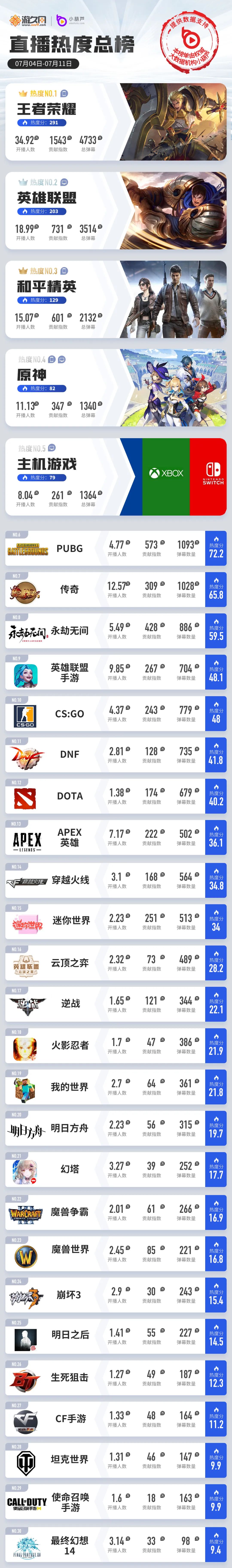 让人比较意外的是《传奇》这款上古游戏的排名依然稳健的上升,从上周的 13 名,一路爬升至第 7 名,可见此类型游戏的直播生命力也着实顽强。