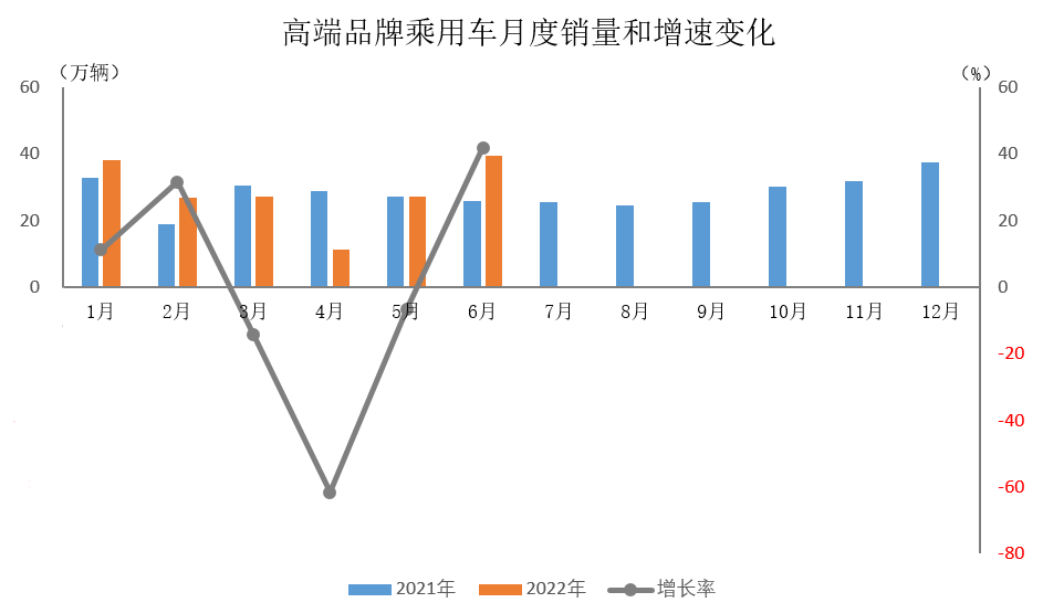 2022 年 6 月,国内生产的高端品牌乘用车销量完成 39.5 万辆,同比增长 41.9%。