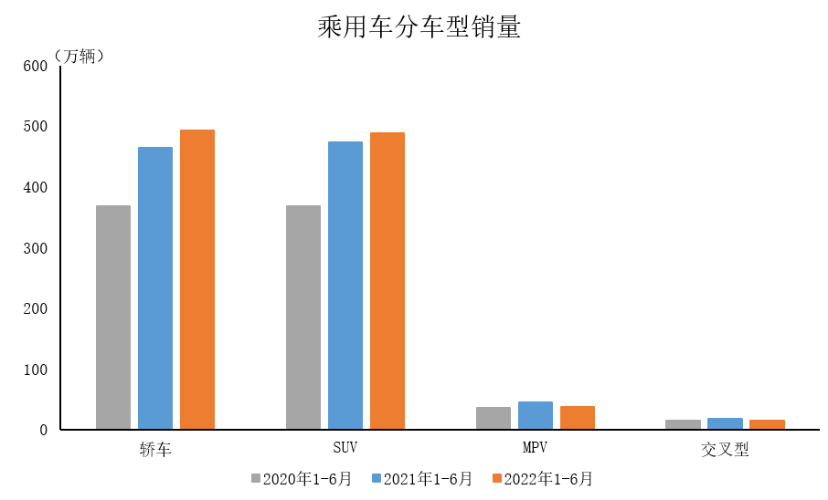 2022 年 1-6 月,与上年同期相比,基本型乘用车(轿车)和运动型多用途乘用车(SUV)销量结束下降,呈小幅增长,其他两大类品种依然呈一定下降。