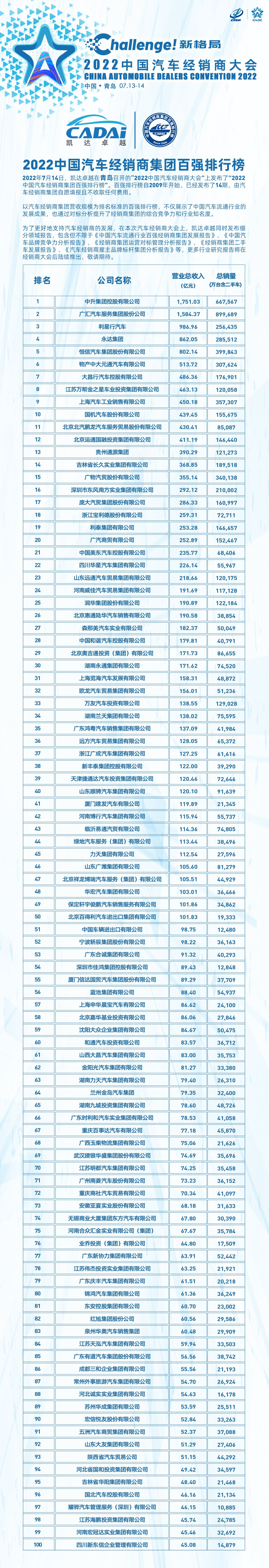 2022中国汽车经销商集团百强排行榜 更多阅读:中国汽车流通协会:2023中国汽车经销商集团百强排行榜中国汽车流通协会:汽车经销商集团数字化转型调查中国汽车流通协会:2020中国汽车经销商集团百强排行榜中国汽车流通协会:2023中国汽车经销商集团发展状况与综合评价中国汽车流通协会:2020年4月中国进口汽车市场月报中国汽车工业协会:2021年5月汽车工业运行情况简述2020年1月份京城汽车市场分析中国汽车工业协会:2023年1-2月我国汽车商品出口金额前十国情况简析中国汽车工业协会:2022年3月前十位轿车品牌销量排名中国汽车流通协会:2020年3月份国内狭义乘用车市场销量达104.5万辆 同比下降40.4%中国汽车流通协会:2020年第一季度豪华品牌新增授权4s店57家 退网4s店41家中国汽车流通协会:2022年4月中国汽车保值率报告商务部:2020年1-5月我国汽车出口37.3万辆ACEA:2023年全球和欧洲汽车业报告挪威道路联合会:2024年挪威新车销量88.9%为电动车 市场占比创新高