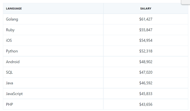 总体而言,各国总体编程语言薪资水平中,Golang和Ruby往往是高薪语言,而JavaScript和PHP则是工资最低的语言。