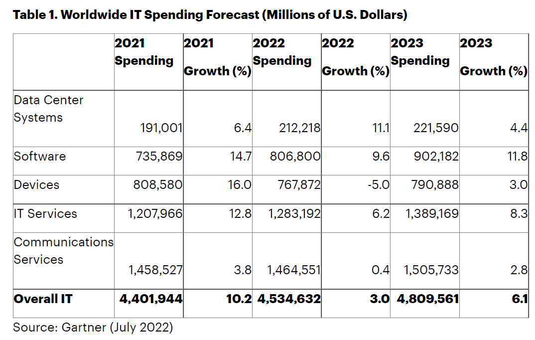 根据 Gartner的最新预测,2022 年全球 IT 支出预计将达到 4.5 万亿美元,比 2021 年增长 3%。虽然 IT 支出预计将在 2022 年增长,但由于消费者在个人电脑、平板电脑和打印机上的支出减少,增速将远低于 2021 年,导致设备支出减少了 5%。