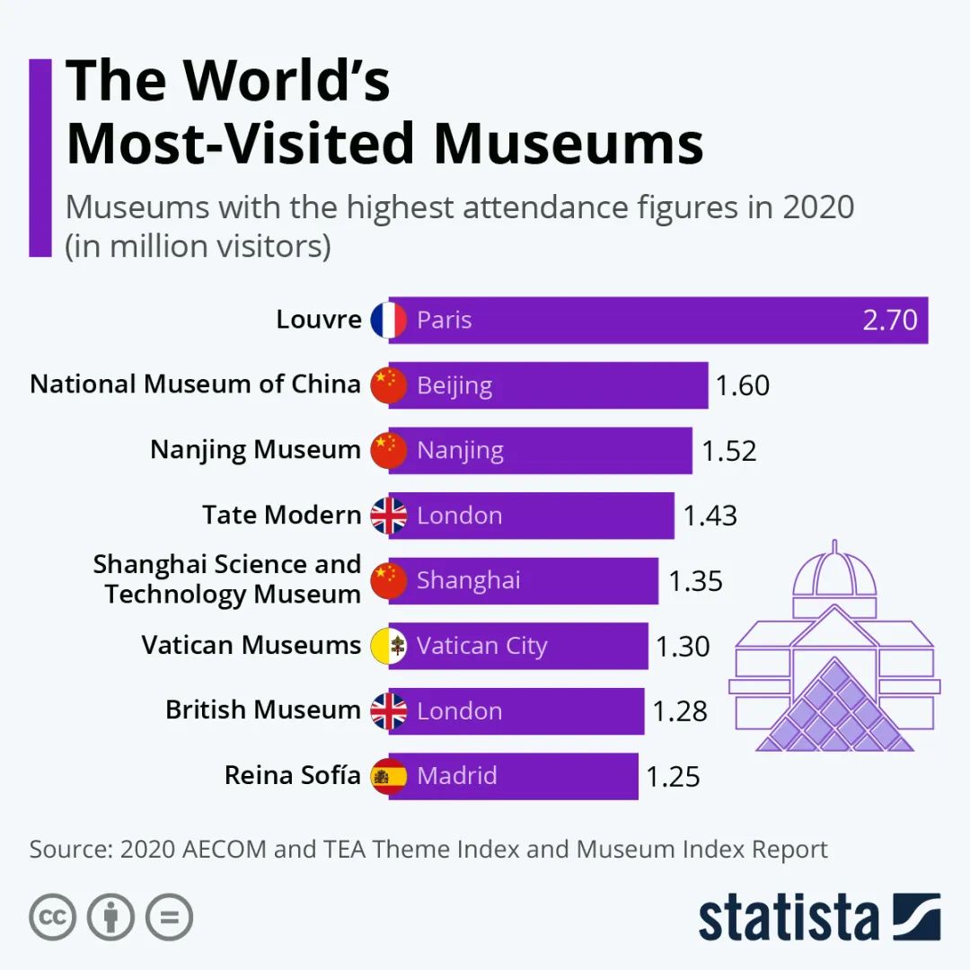 即使由于新冠而导致世界各地的旅行限制、宵禁和旅游景点关闭,卢浮宫博物馆在 2020 年仍有 270 万人参观其展览。如以下 Statista 发布的图表所示,过去一年访问量最大的博物馆亚军与之的距离也是相距甚远的。