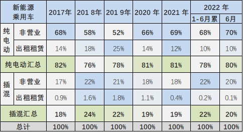 2017-2019 年的新能源乘用车的出租租赁类占比逐步提升,随后 2020 年开始的纯电动出租租赁的占比持续下降,2022 年降到 9%。由于私人市场供给不足,纯电动 2022 年 6 月出租租赁的占比在 10%,稍有下降。