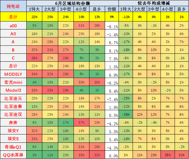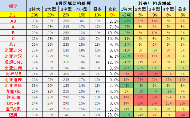 而插电混动在特大城市和小城市和县乡市场总体表现相对是较低状态。