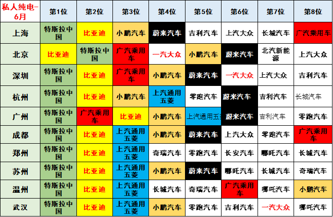 私人纯电动市场的特色相对鲜明,高端化趋势极其明显。比亚迪表现优秀,除了广州外基本都是第一。天津是零跑等较强,郑州的上汽通用五菱,其他地区大部分都是高端化的。