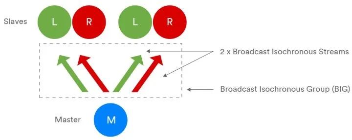 同时,LE Audio同步通道定义了一个有时间依赖的数据的传输通道和传输策略。首先是一个对于多接收方同步获取数据的机制;其次是定义了发送方在允许的时间外丢弃数据,从而保证接收方收取的数据满足时效要求。这不仅保证蓝牙可以在低功耗的情况下解决延迟问题,LE Audio还可以向多个耳机同时传输,实现一对多的音频传输。