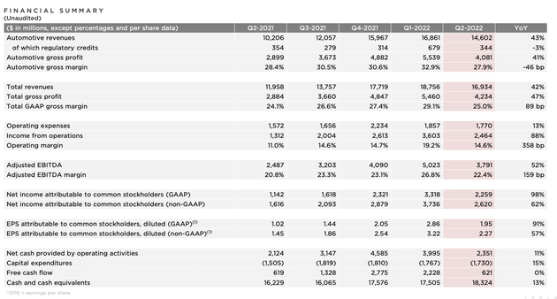 电动汽车制造商特斯拉公布了截至6月30日的2022年第二季度财报。财报显示,特斯拉第二季度营收169.3亿美元,同比增长42%;归属于特斯拉股东的净利润为22.6亿美元,同比增长98%;归属于特斯拉股东的每股摊薄收益为1.95美元,同比增长91%。财报发布后,特斯拉股价在盘后交易中上涨逾1%。