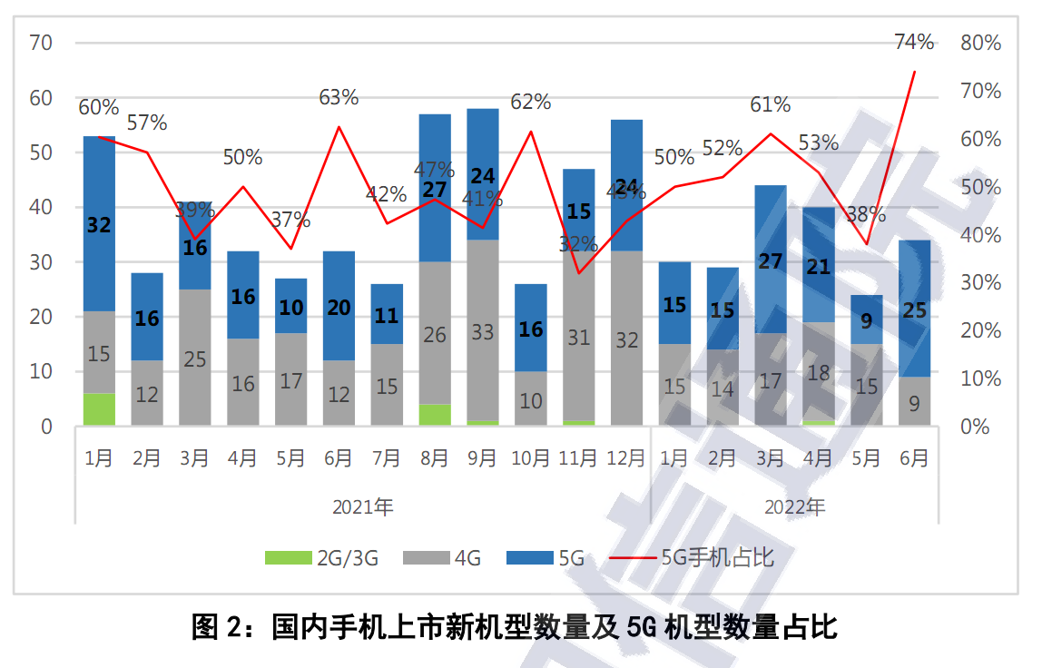 新机型方面,6月上市34款(智能手机28款),同比增长6.3%,其中5G手机25款,同比增长25.0%;上半年累计201款(智能手机168款),同比下降5.6%,其中5G手机112款,同比增长1.8%,占同期手机上市新机型数量的55.7%。