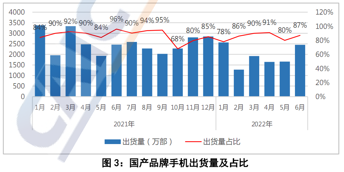 品牌方面,国产手机6月出货量2451.4万部,同比下降0.5%,占同期手机出货量的87.5%;上半年累计1.15亿部,同比下降25.9%,占同期手机出货量的84.5%。