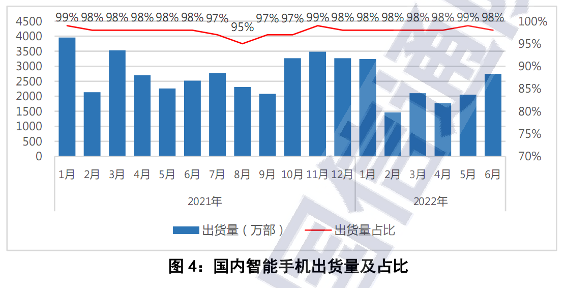 根据中国信通院最新报告,2022年6月,国内手机市场出货量2801.7万部,同比增长9.2%,上半年累计出货量1.36亿部,同比下降21.7%。其中,智能手机6月出货量2747.8万部,同比增长9.1%,上半年累计1.34亿部,同比下降21.7%。